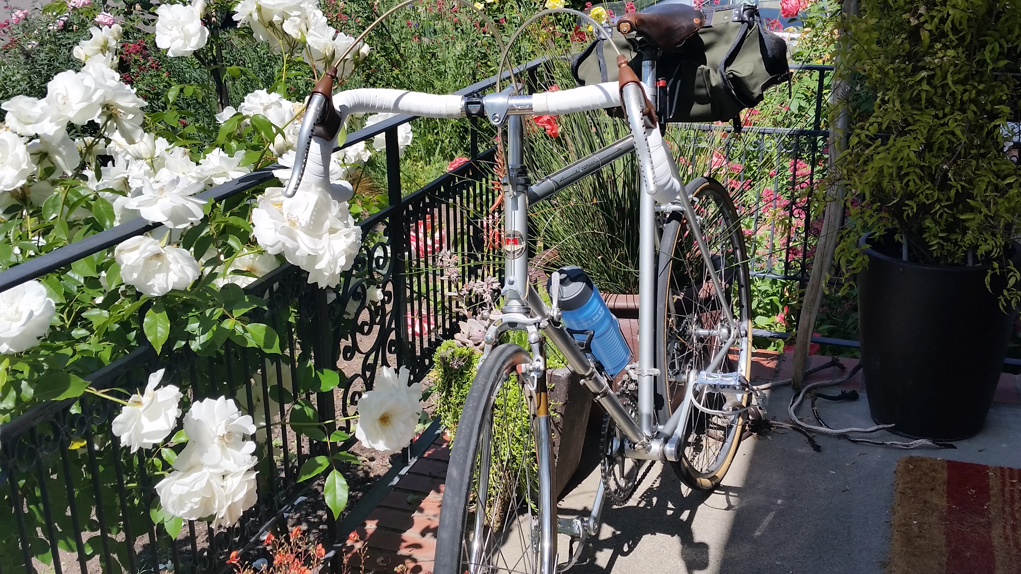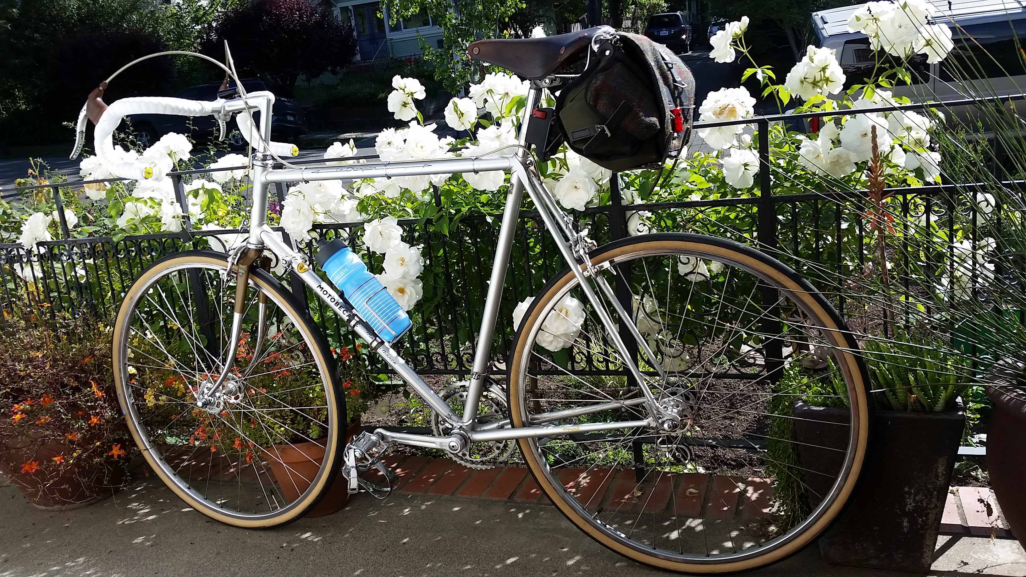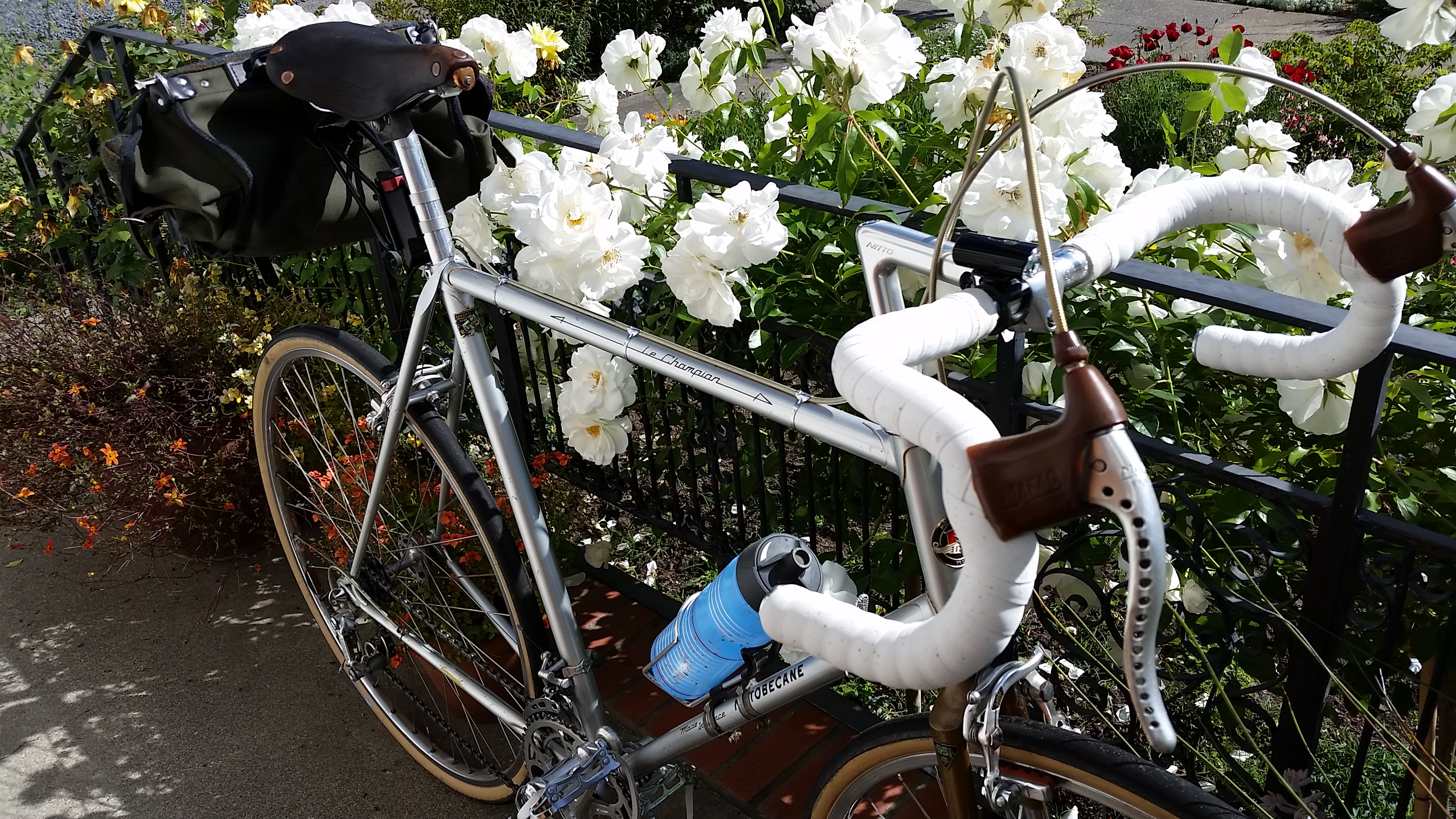 New stuff - Nitto Technomic Deluxe stem, Nitto randonneur bars, Mafac 2000 brakes & Koolstop pads, Compass 32mm Stampede Pass tires, Carradice Barley bag in Harris Tweed. | ||